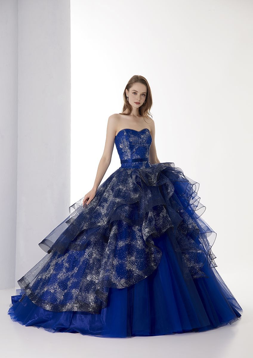 ミッドナイトブルーに星屑のような繊細に光るグリッターを施し、動くたびにキラキラ輝く素敵な1着です。