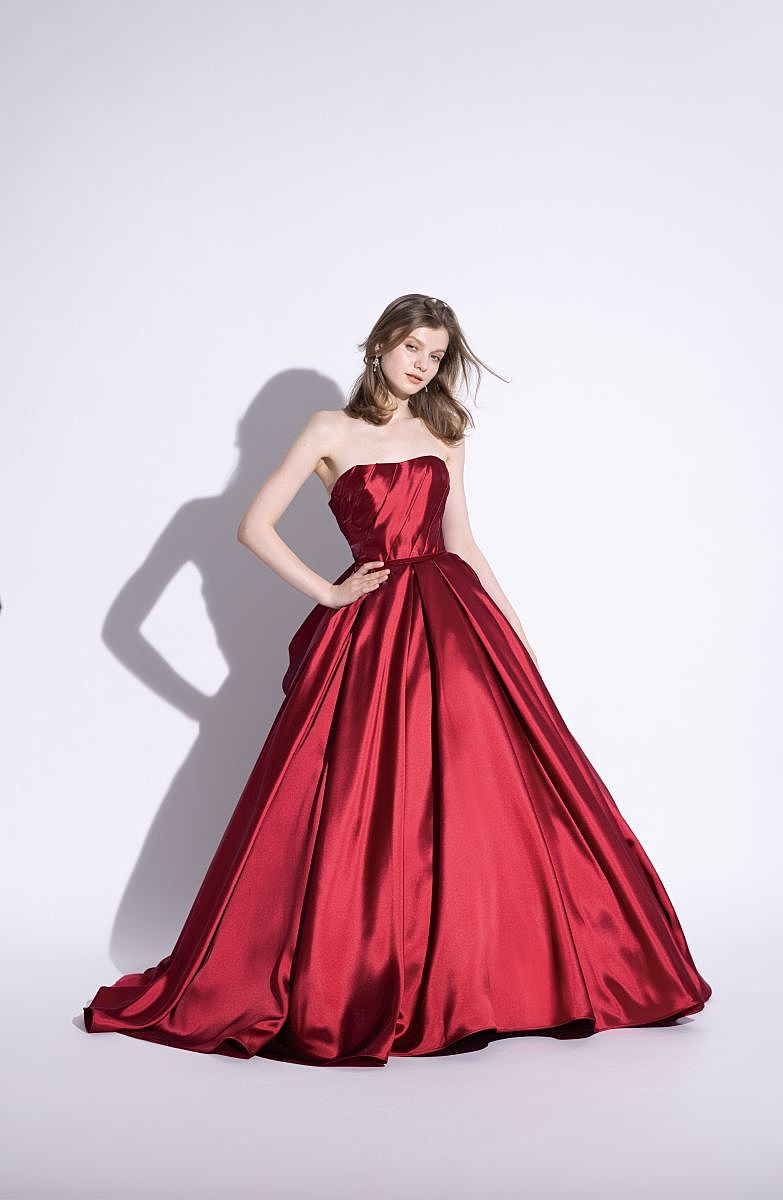 生地の染めからこだわった深い赤が主役らしいオーラを放ちます。バックの立体的なリボンも印象的。