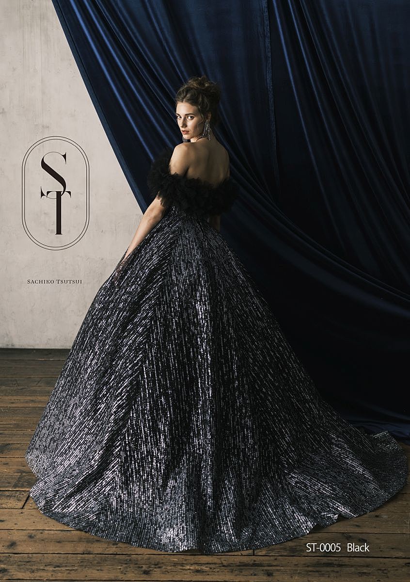 光輝くスターダストドレス。それぞれ形の違う小さなグリッターの粒がおこしたデザインは、流れが美しいグラデーションを生み出しています。シンプルなAラインのシルエットで柄の美しさを最大限に引き出し、ドラマティックに。