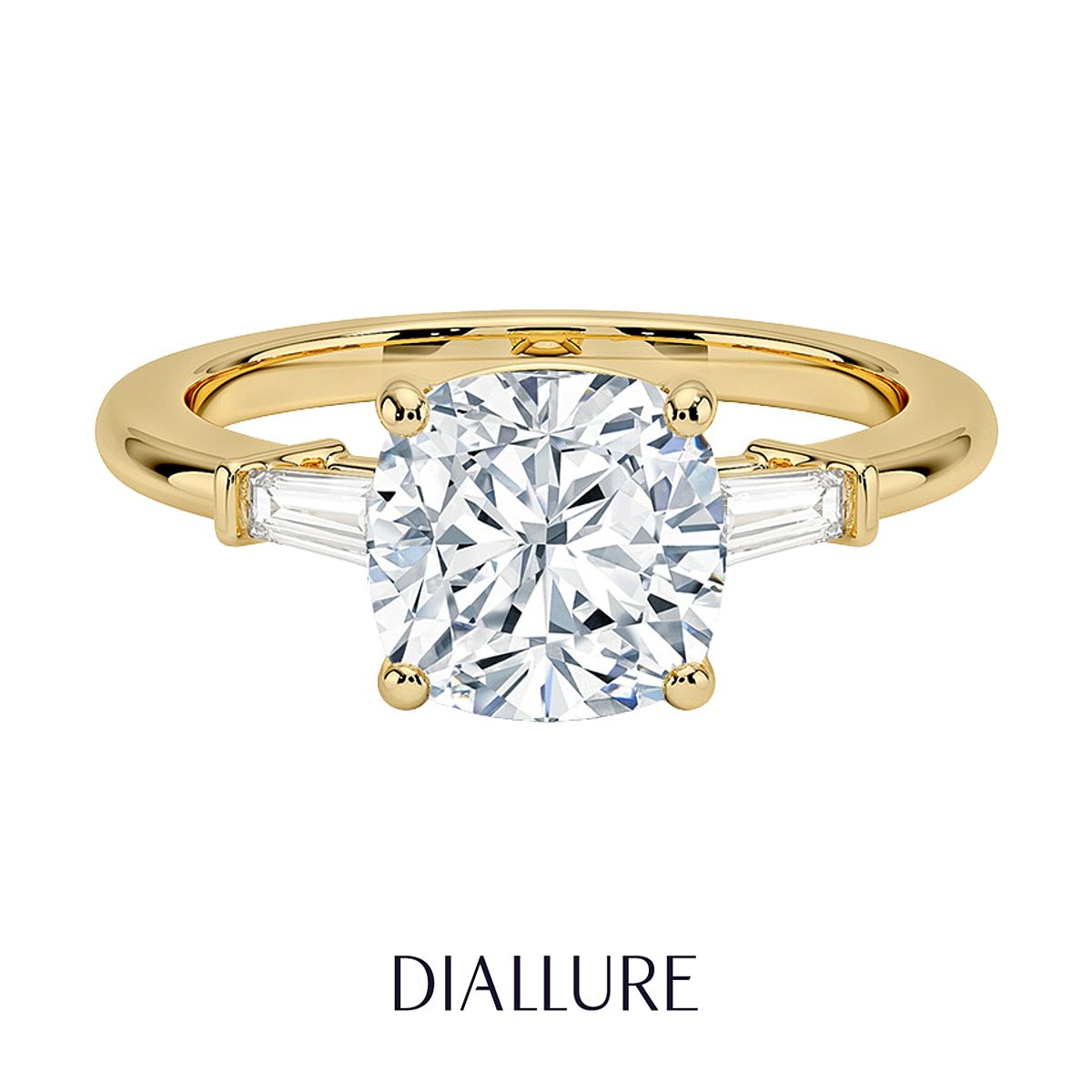 透明感とクリアな輝きが特徴のアッシャーカットのセンターストーンのサイドをテーパードバゲットカットのダイヤで挟んだクラシックなデザイン。