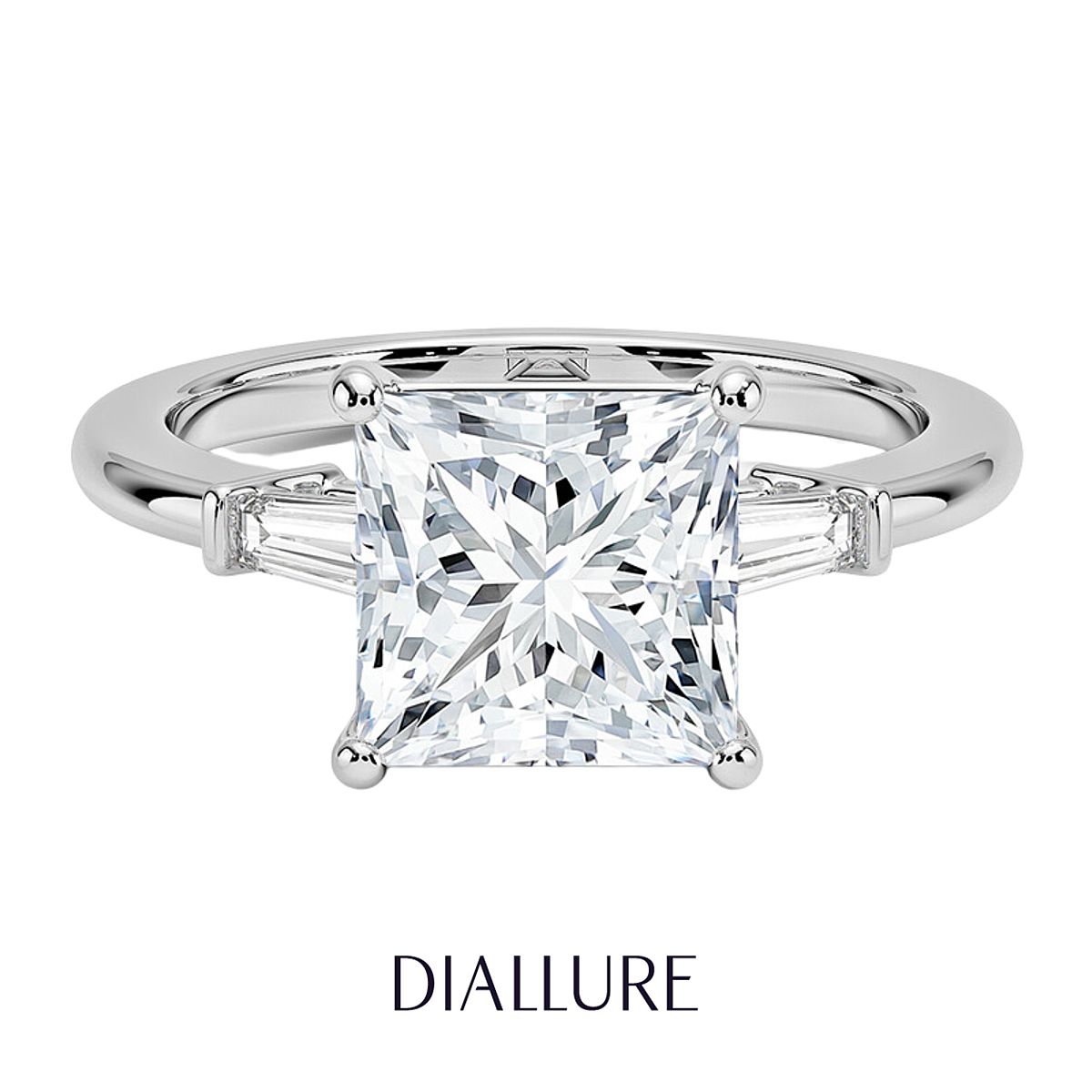 透明感とクリアな輝きが特徴のアッシャーカットのセンターストーンのサイドをテーパードバゲットカットのダイヤで挟んだクラシックなデザイン。