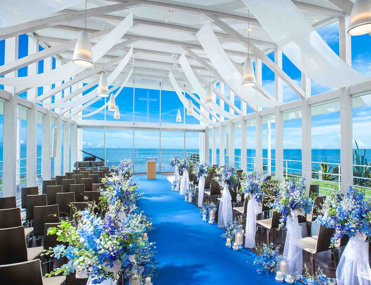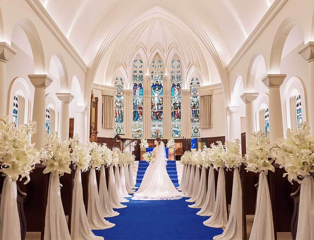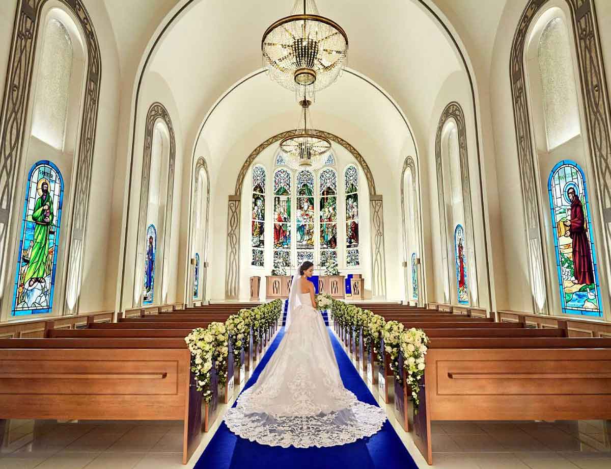 青いバージンロードのチャペルが素敵です!ステンドグラスも素晴らしく、お天気が崩れてしまっても、式には影響がない点も良かったです!他の会場よりも、新郎新婦の立つ場所が高いので、後ろの方に座っている参列者からもしっかり見てもらうことができます☺️