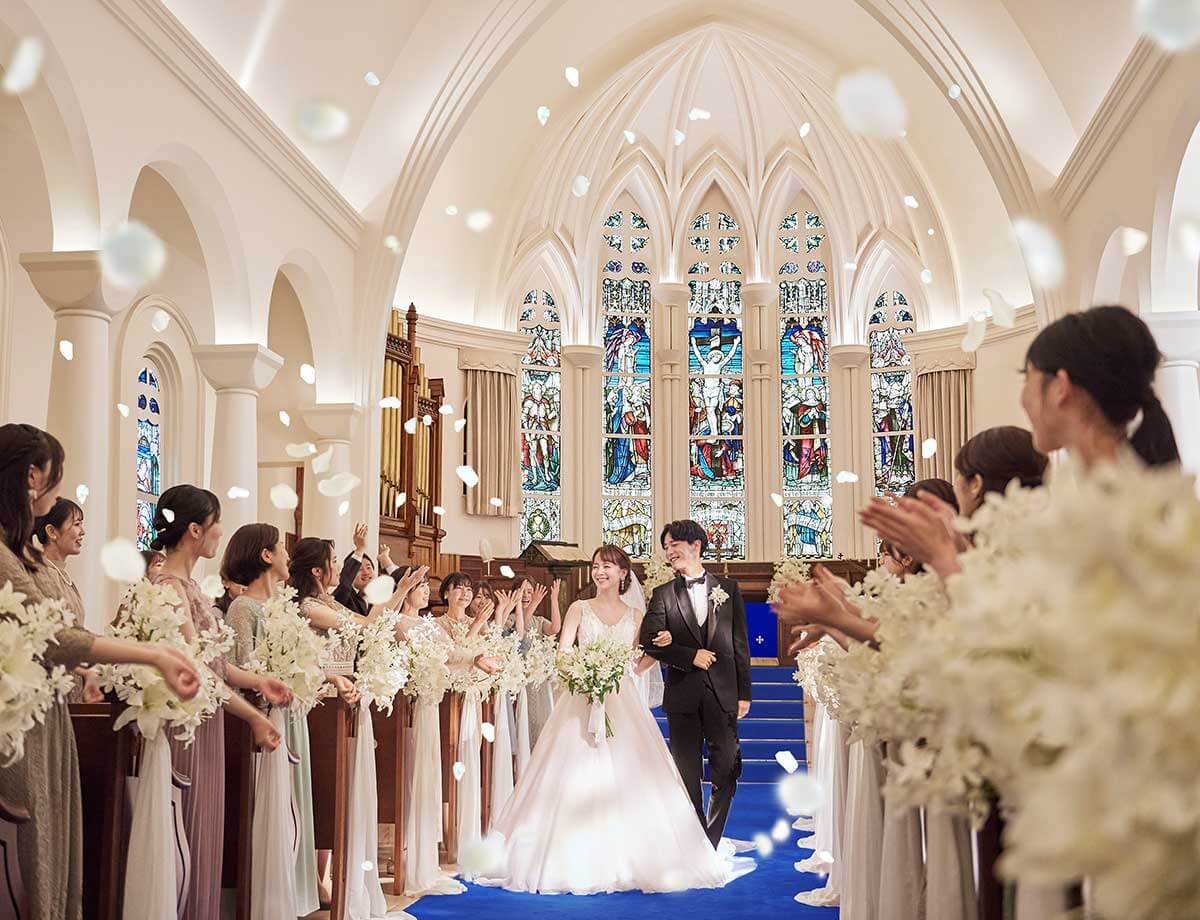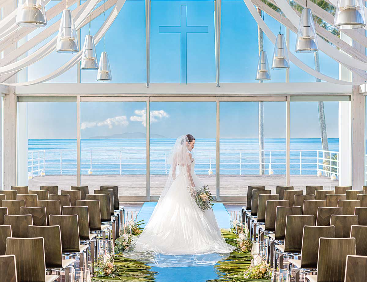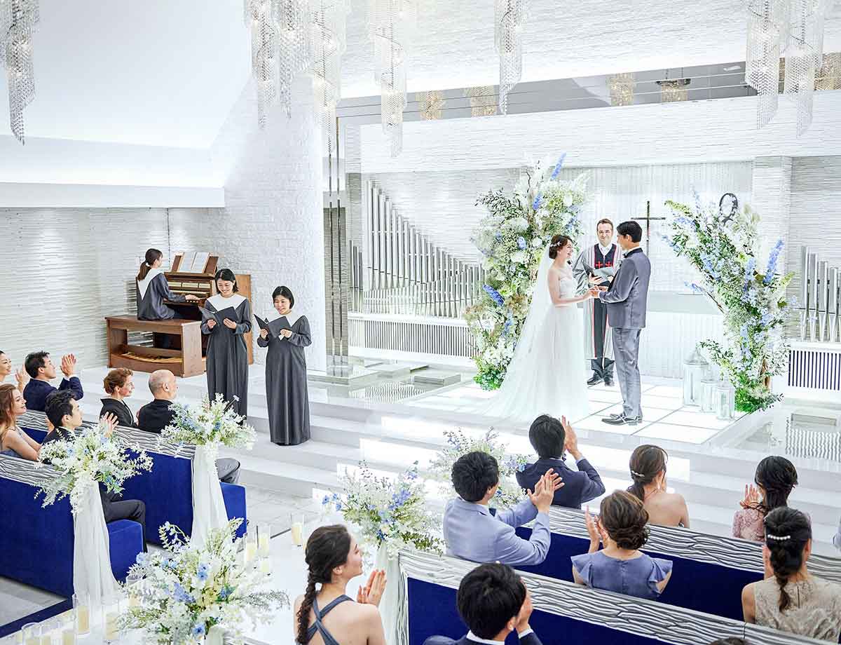 青いバージンロードのチャペルが素敵です!ステンドグラスも素晴らしく、お天気が崩れてしまっても、式には影響がない点も良かったです!他の会場よりも、新郎新婦の立つ場所が高いので、後ろの方に座っている参列者からもしっかり見てもらうことができます☺️