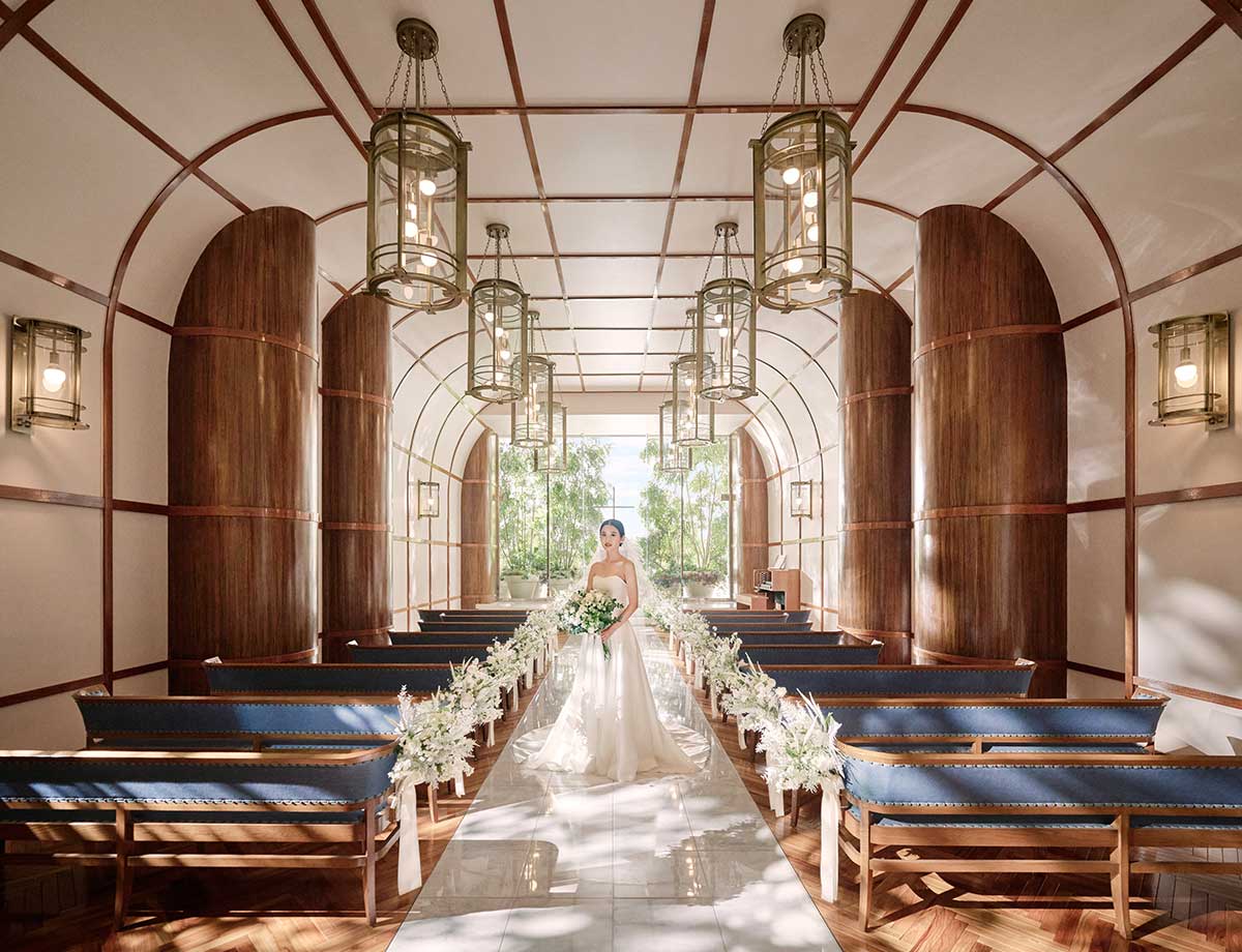 チャペルは豪華客船の船内をイメージしていて広々、自然光が差し込み、明るいです!どの会場も素敵で悩みましたが、モナコの高い天井とホテルウェディングらしさに惹かれました💓