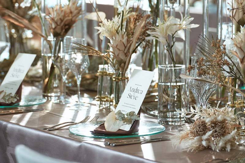 パーティ会場のテーブルコーディネートやレイアウトの一例をご紹介。結婚式直前のタイミングなら先輩カップルのセッティングが見られることも。アイデアを参考に自分たちらしいイメージを膨らませてみましょう。