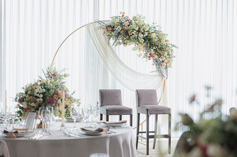 パーティ会場のテーブルコーディネートやレイアウトの一例をご紹介。結婚式直前のタイミングなら先輩カップルのセッティングが見られることも。アイデアを参考に自分たちらしいイメージを膨らませてみましょう。
