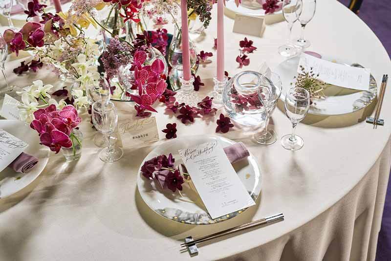 パーティ会場のテーブルコーディネートやレイアウトの一例をご紹介。結婚式直前のタイミングなら先輩カップルのセッティングが見られることも。アイデアを参考に自分たちらしいイメージを膨らませてみましょう。
