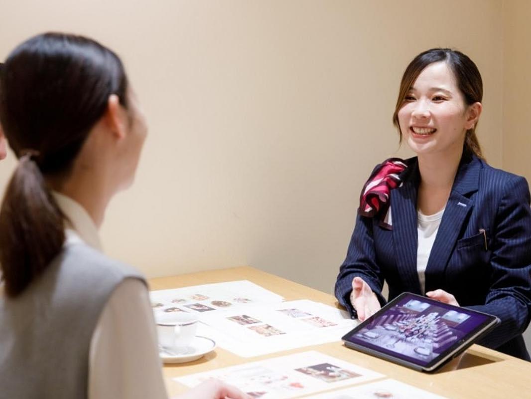ふたりの結婚式のイメージづくりに役立つ、挙式会場&パーティ会場見学。経験豊富なスタッフがふたりの顔ぶれにあわせてパーティ提案をしてくれます。