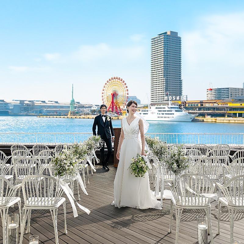 【1組の特別感】空と海に誓うセレモニーを体験!水平線を眺めるチャペルは開放的で神戸の雰囲気をお愉しみいただけます。挙式後はテラスで過ごす時間もおすすめ☆