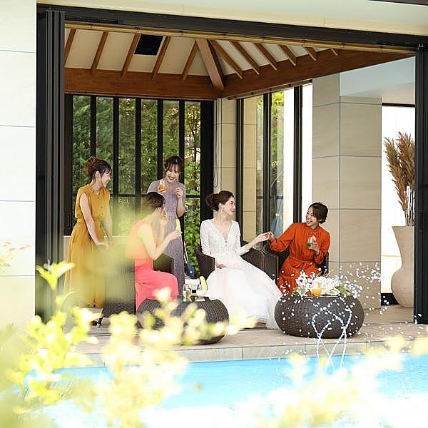 【南国のリゾート「バリ」を感じる上質×リラックス感】プールのある待合空間のガーデンには水上テラスがあり、涼し気で開放的な雰囲気♪組数限定だから、当日はふたりの自由に会場全体をコーディネート可能!