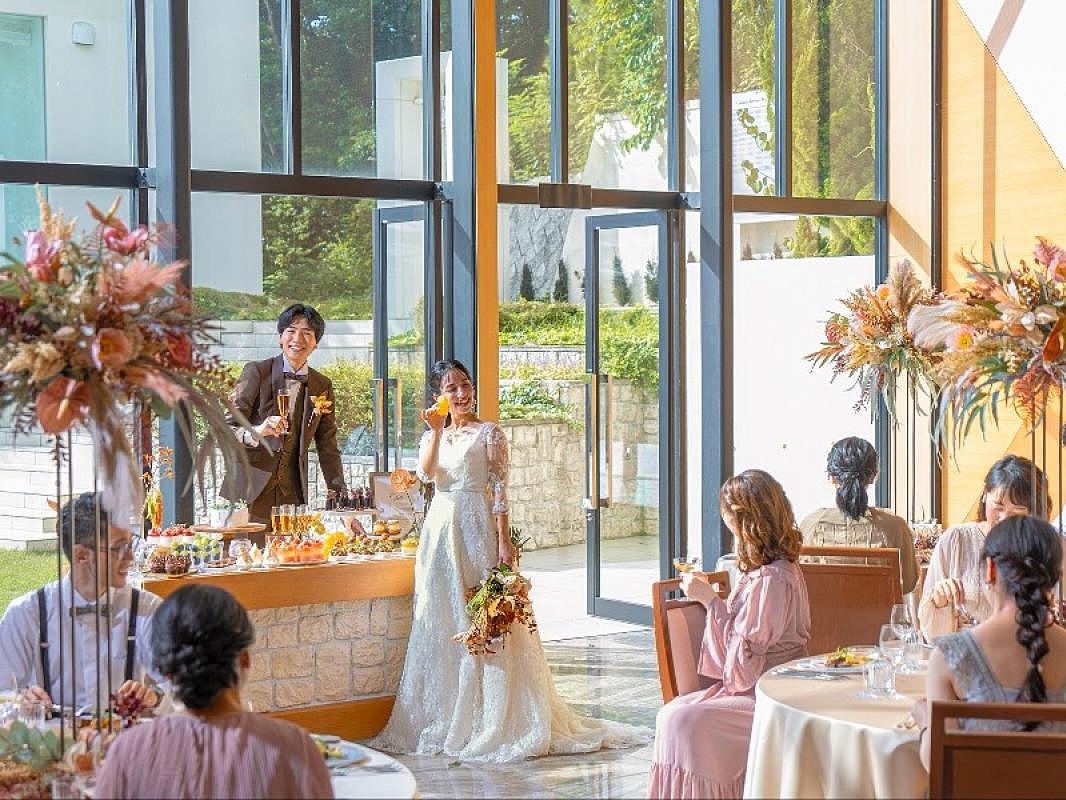 どの空間にも大きな窓があり、東山の緑豊かな自然が鮮やかなコーディネートをサポート!どんなコーディネートにも合う会場ですのでナチュラルなテイストだけでなくオリジナリティある色合いのコーディネートも人気