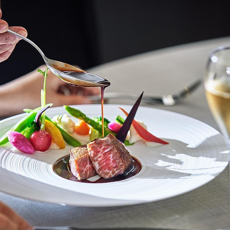 【国産牛フィレ肉やオマール海老試食】会場内のオープンキッチンから運ばれる料理は、ゲストも感動する美味しさ。五感で楽しめる全5品のハーフコースを無料で試食♪会場からの絶景と共にぜひ体験してみて♪
