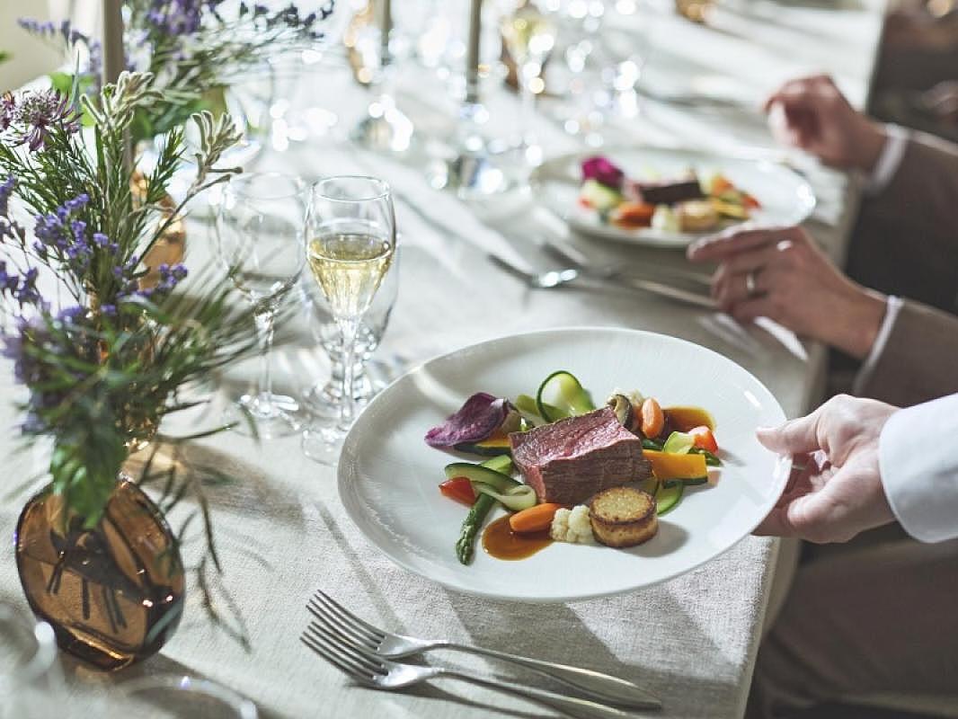 【国産牛フィレ肉やオマール海老試食】会場内のオープンキッチンから運ばれる料理は、ゲストも感動する美味しさ。五感で楽しめる全5品のハーフコースを無料で試食♪会場からの絶景と共にぜひ体験してみて♪