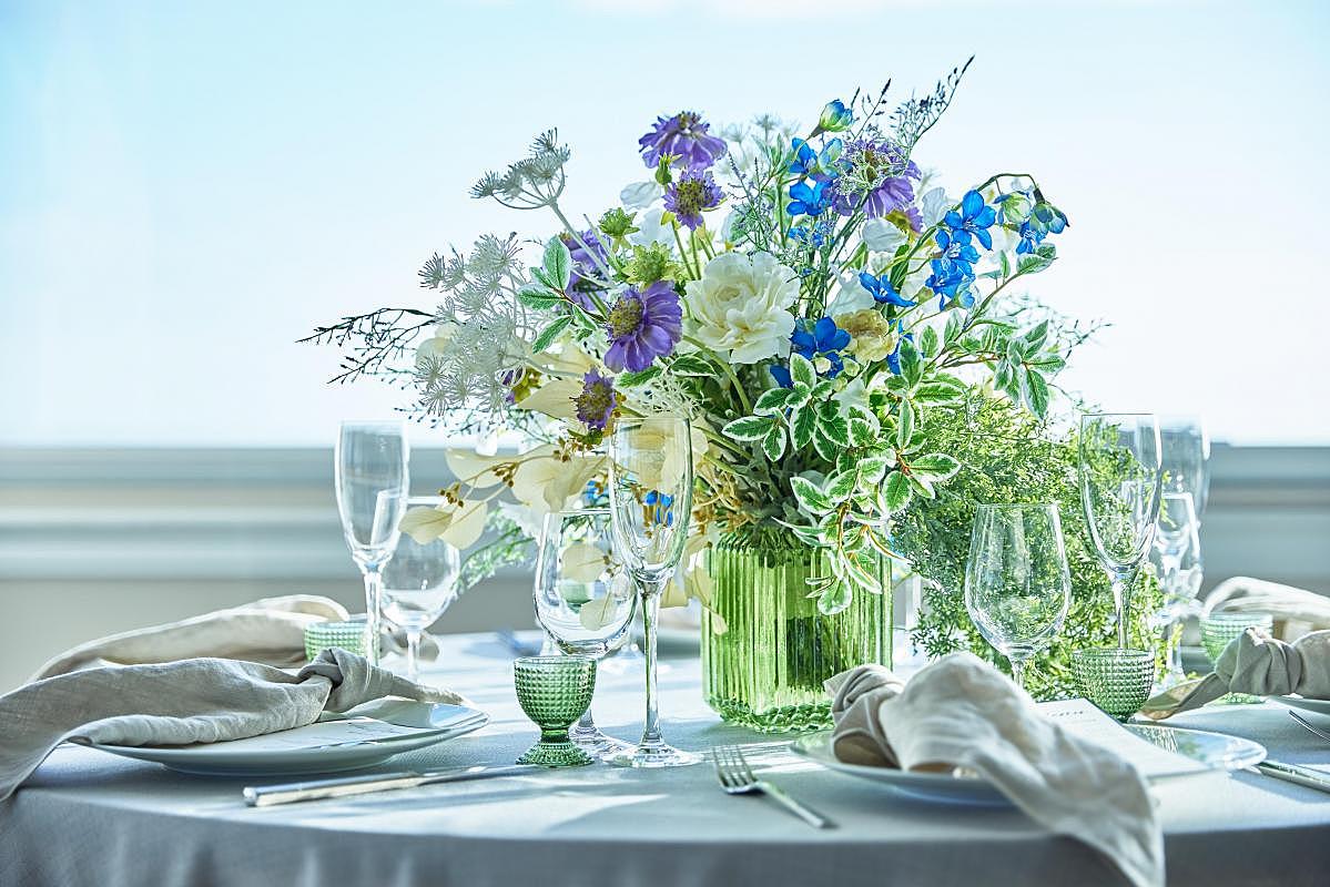 【少人数専用会場のおすすめコーディネートをご提案】景色をバックに自分好みのコーディネートを叶えるためのペーパーアイテムやテーブルクロスなどを実際に展示!当日がイメージしやすい見学会だから安心感抜群!