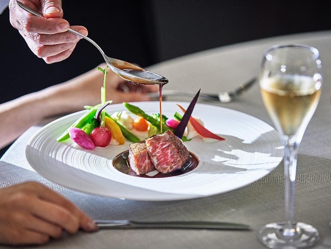 【華やかな披露宴を彩る料理体験】オープンキッチンから届く出来立ての一皿を、シェフのライブ感と共に堪能。国産牛フィレやオマール海老など贅沢食材で、五感を刺激する美食のひとときを体験できます。