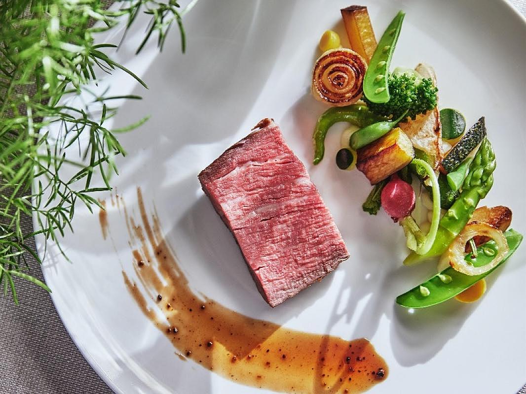 【国産牛やオマール海老試食】会場内のオープンキッチンから運ばれる料理は、ゲストも感動する美味しさ。五感で楽しめる全5品のハーフコースを無料で試食♪会場からの絶景と共にぜひ体験してみて♪