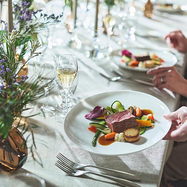 【国産牛フィレ肉やオマール海老試食】会場内のオープンキッチンから運ばれる料理は、ゲストも感動する美味しさ。五感で楽しめる全5品のハーフコースを無料で試食♪会場からの絶景と共にぜひ体験してみて♪