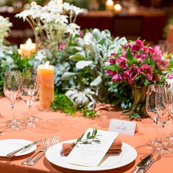 ホテルのインテリア同様、バンケットルームもすべてに本物が息づく空間。一歩足を踏み入れると、華やかでラグジュアリーな気分になる会場に合わせて、唯一無二のテーブルコーディネートを展示しております。