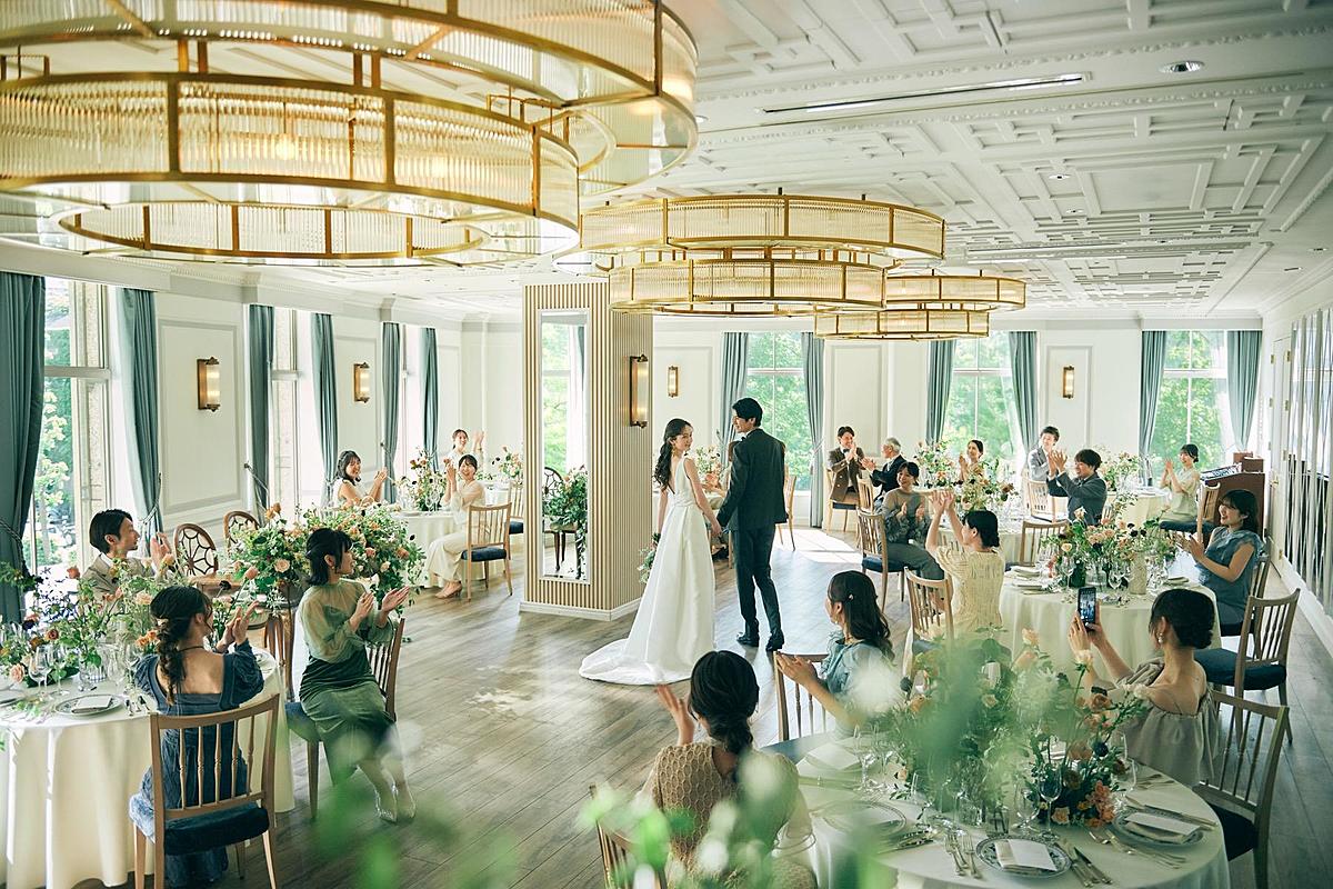 天井に装飾された円形のシャンデリアや世界に3台しかないチェコのアンティークピアノなど、クラシカルなインテリアをしつらえたエレガンスな空間。まるでおふたりの邸宅に招くパーティのようにアットホームな距離でゲストと会話を愉しんで。レストランならではの美食ときめ細やかなおもてなしでゆっくりとお寛ぎいただけます。