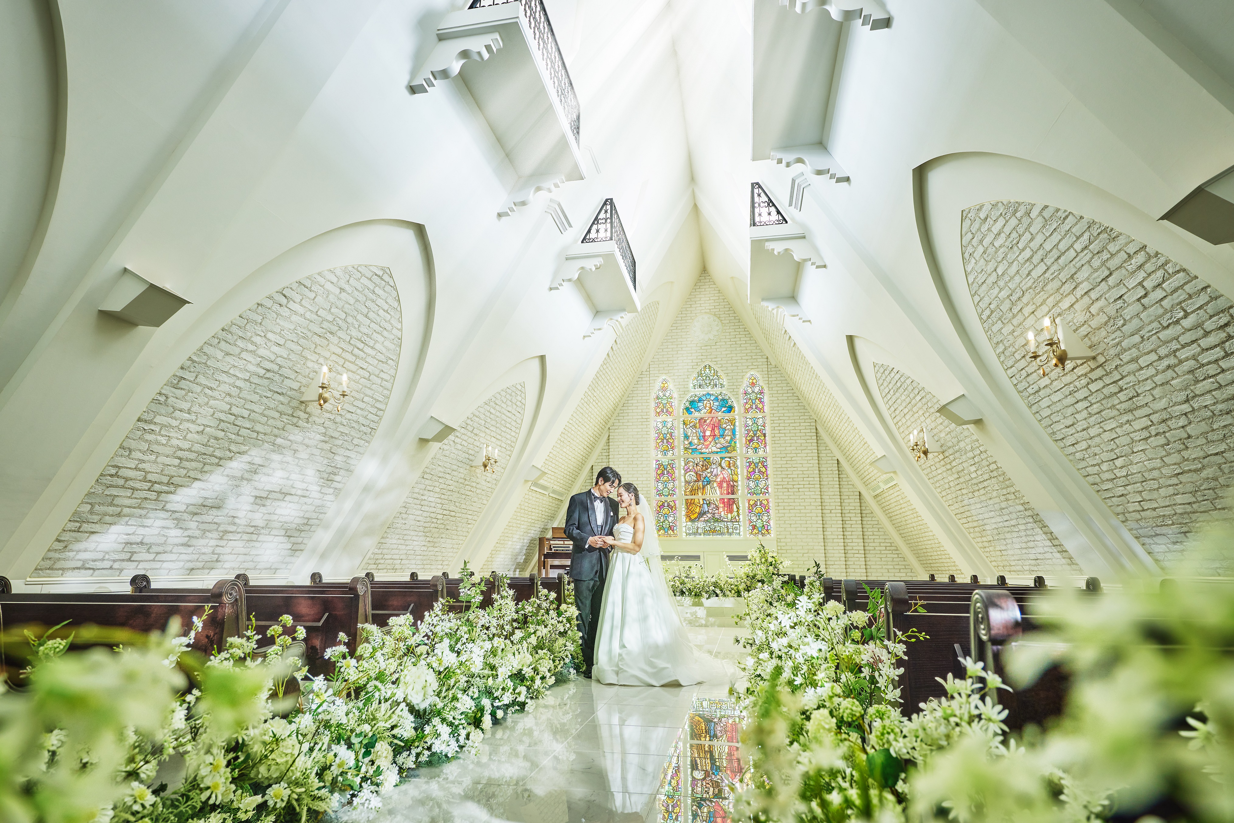 話題のインターパークエリアに新店オープン!パリ街角をイメージした一軒貸切のウエディングが叶う。エリアで非常に稀な3面ステンドグラスが美しいチャペル。