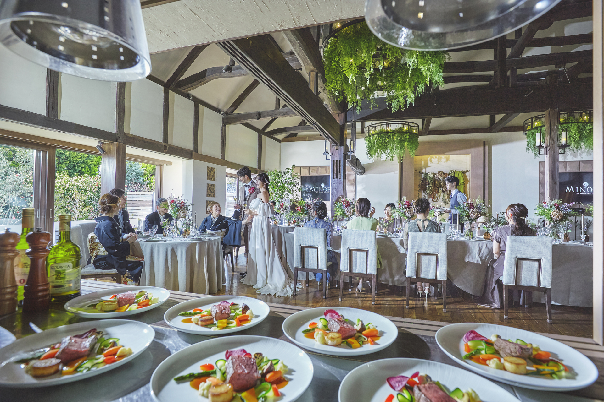古民家をモダンにリノベーションしたデザイナーズ空間は自然光に包まれ、一面大きな窓から差し込み、やわらなか光が心地よい時間を紡ぎだします。スタイリッシュでありながら温かみのあるシャンデリア、調度品に囲まれ、家族や友人と居心地のよいプライベートウエディングを創り上げましょう