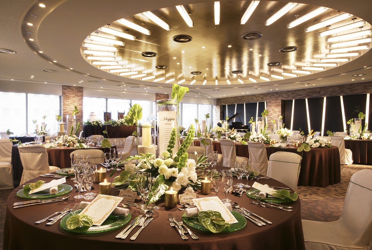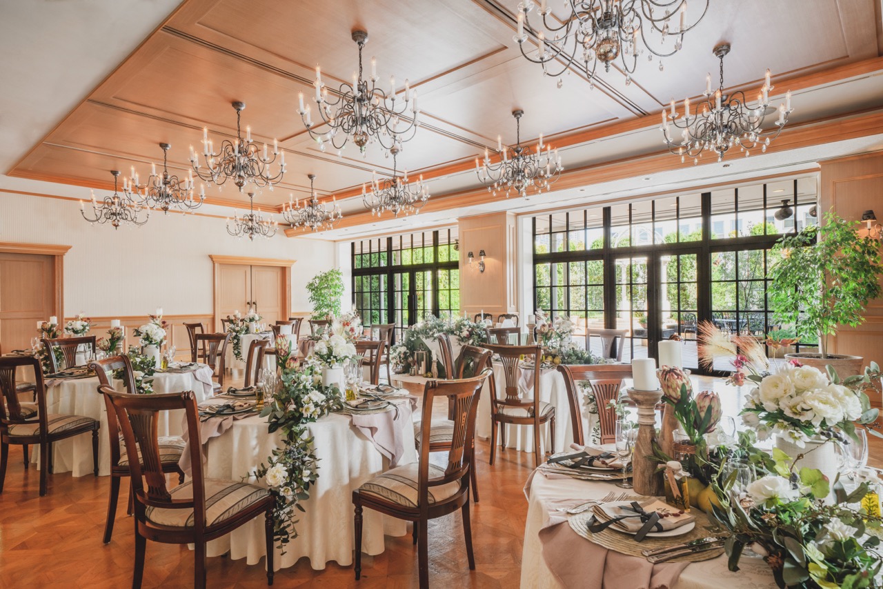 ワンフロア貸切のプライベート会場、少人数のアットホームな食事会場、天井高7mの開放感あふれる会場など5つの会場からおふたりの好みで自由に選べる。