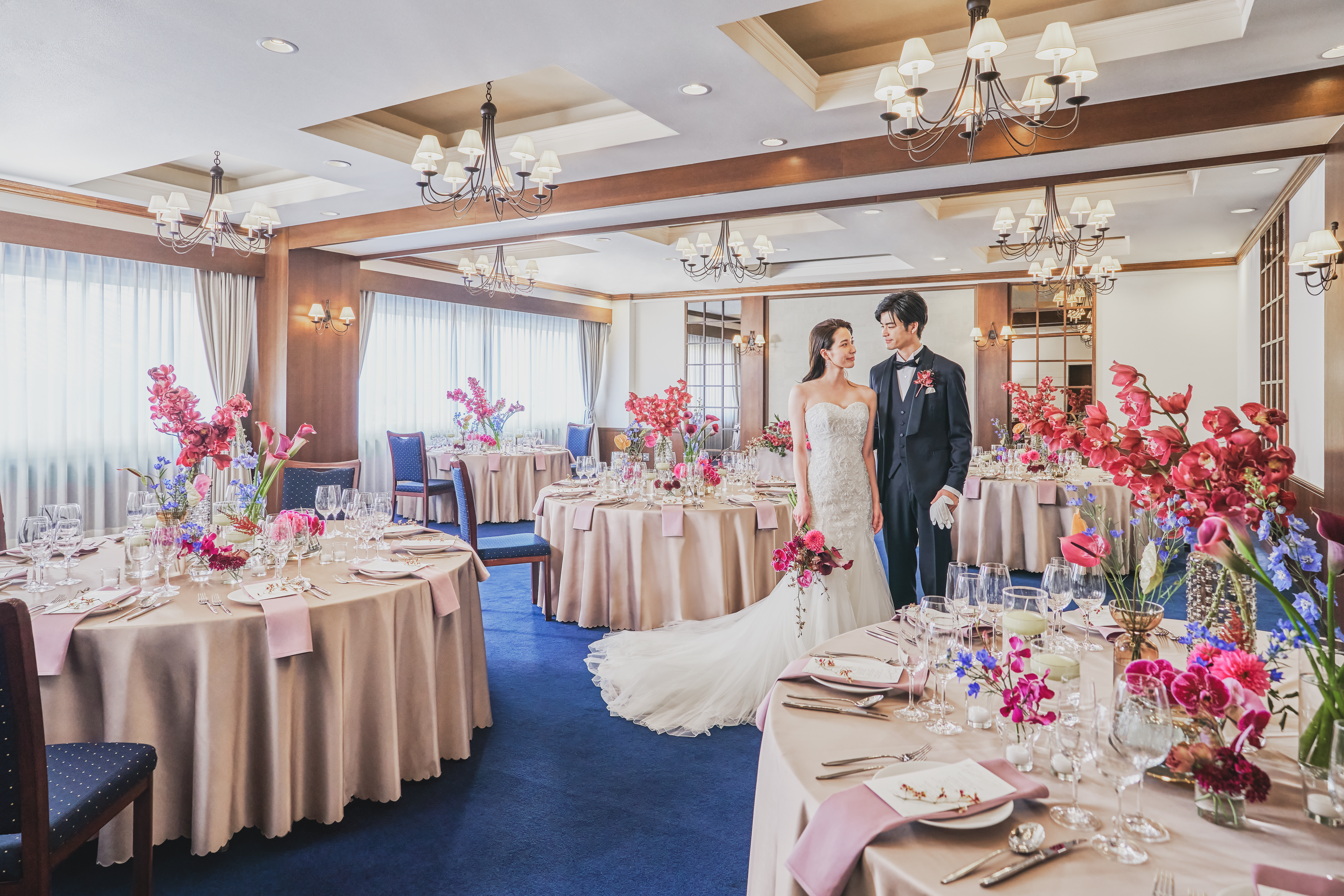 1300年の歴史を持つ縁結びの神様を祀る由緒ある神社。朱塗りの社殿で厳かな神前式が叶い、披露宴会場では和洋どちらの装いも映えるモダンな空間を提供。和とフレンチを融合したお料理でおもてなしできます。