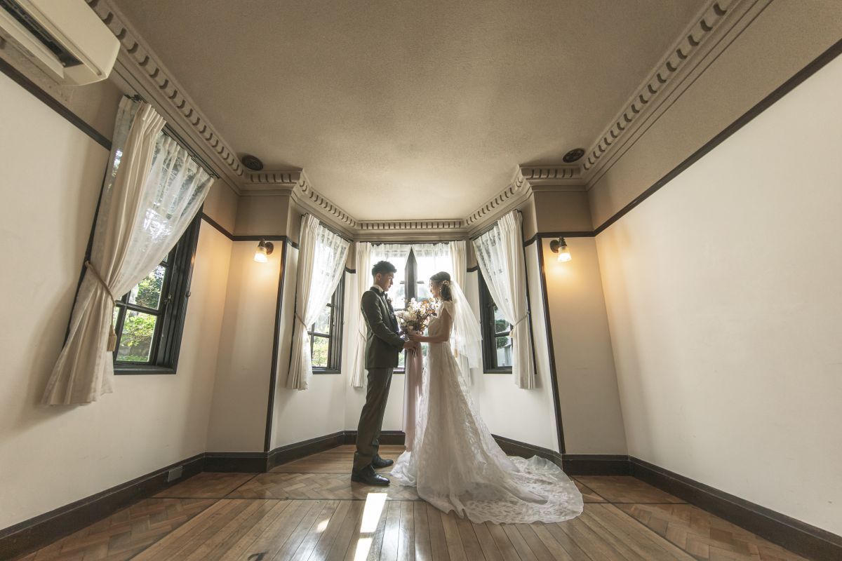 大正13年に建てられ、その歴史的価値の高さから市の景観重要建造物として保存される邸宅が、ふたりの婚礼の舞台に。当時の面影を活かしつつ改装された、和と洋、クラシカルとモダンが息づく大人の贅沢な空間です。