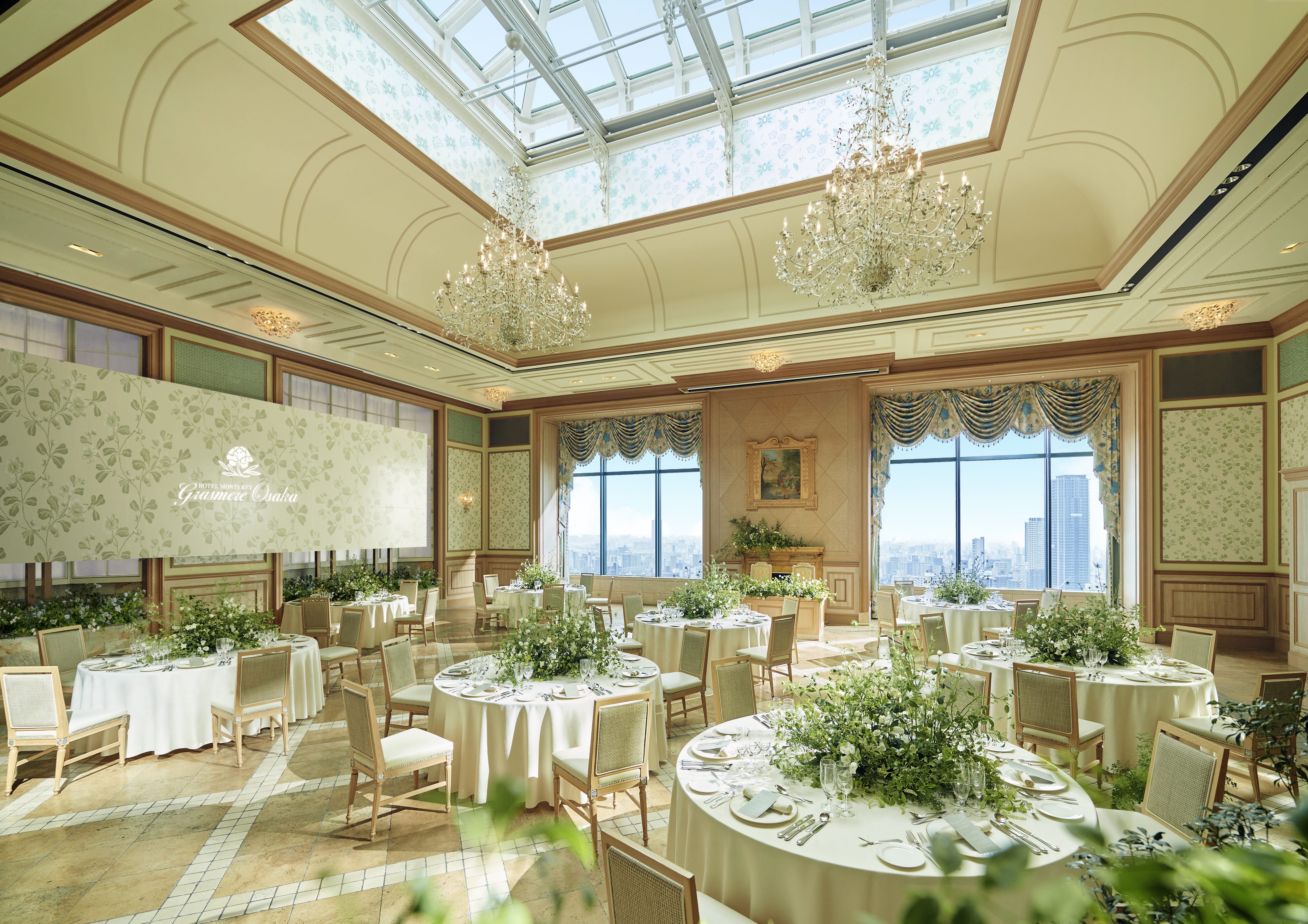 難波駅直結でアクセス抜群。英国調のクラシカルなチャペルと、地上100mの絶景が広がる会場で、洗練された大人のホテルウエディングを。