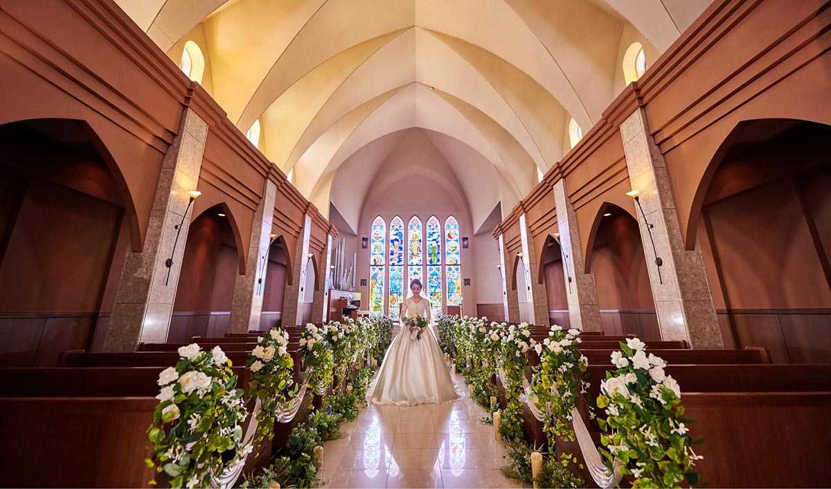 純白のバージンロードと聖なる光が差し込むステンドグラスが印象的
