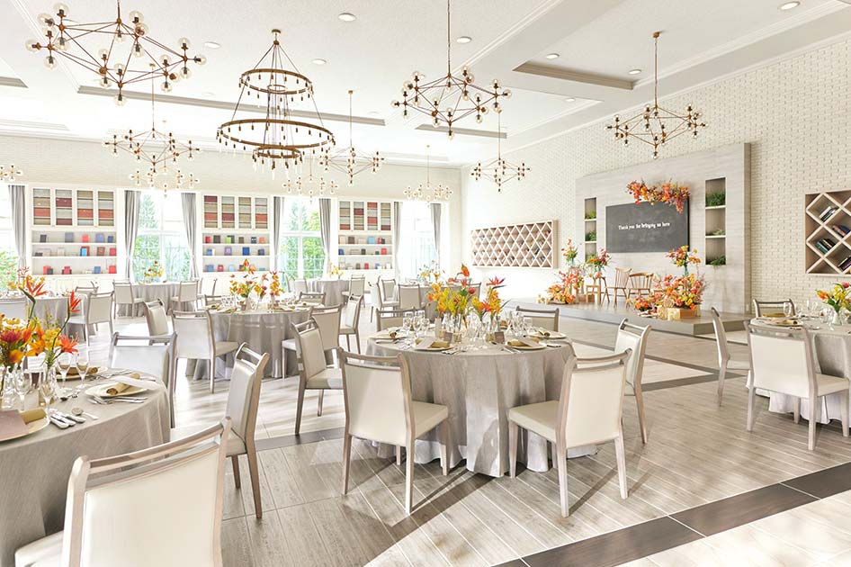 広大なガーデンの中央に位置するのは、アンジェリーナのシンボルともいえる白亜のチャペル。130名着席可能なチャペルはふたりの大切なゲストもたくさん招待できます