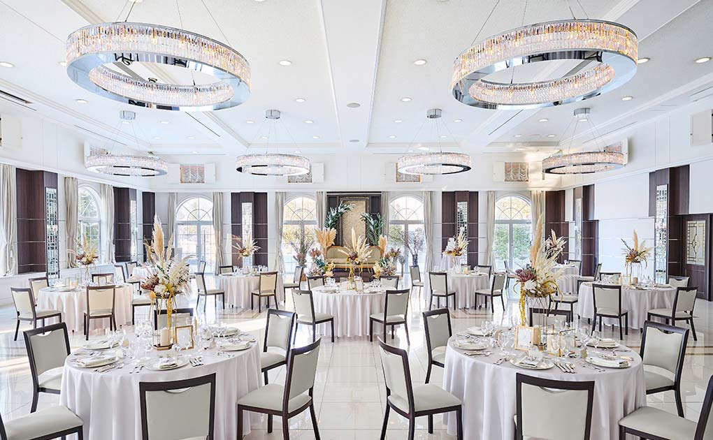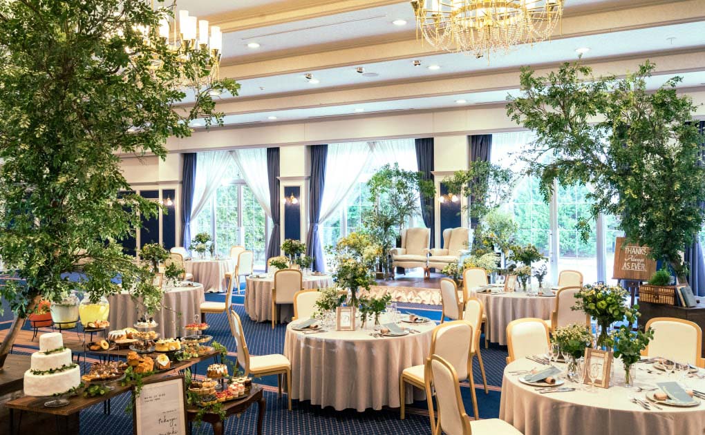 披露宴会場は全てイメージがことなり、ふたりのイメージで自由に選ぶことができます。オープンエアなプライベートガーデンではデザートビュッフェやフォトブースなどゲストと和やかな時間を過ごせる。