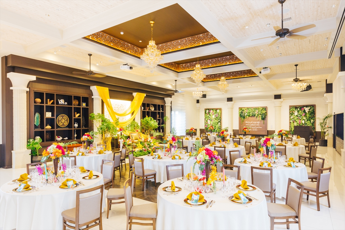 雰囲気異なる2種類のリゾートを彷彿とする館内や、三ツ星シェフが振るうゲスト評価の高い料理、ディズニードレスも取り扱う豊富な種類のドレス、結婚式を盛り上げる定番演出から県内唯一の演出が叶う結婚式場です。