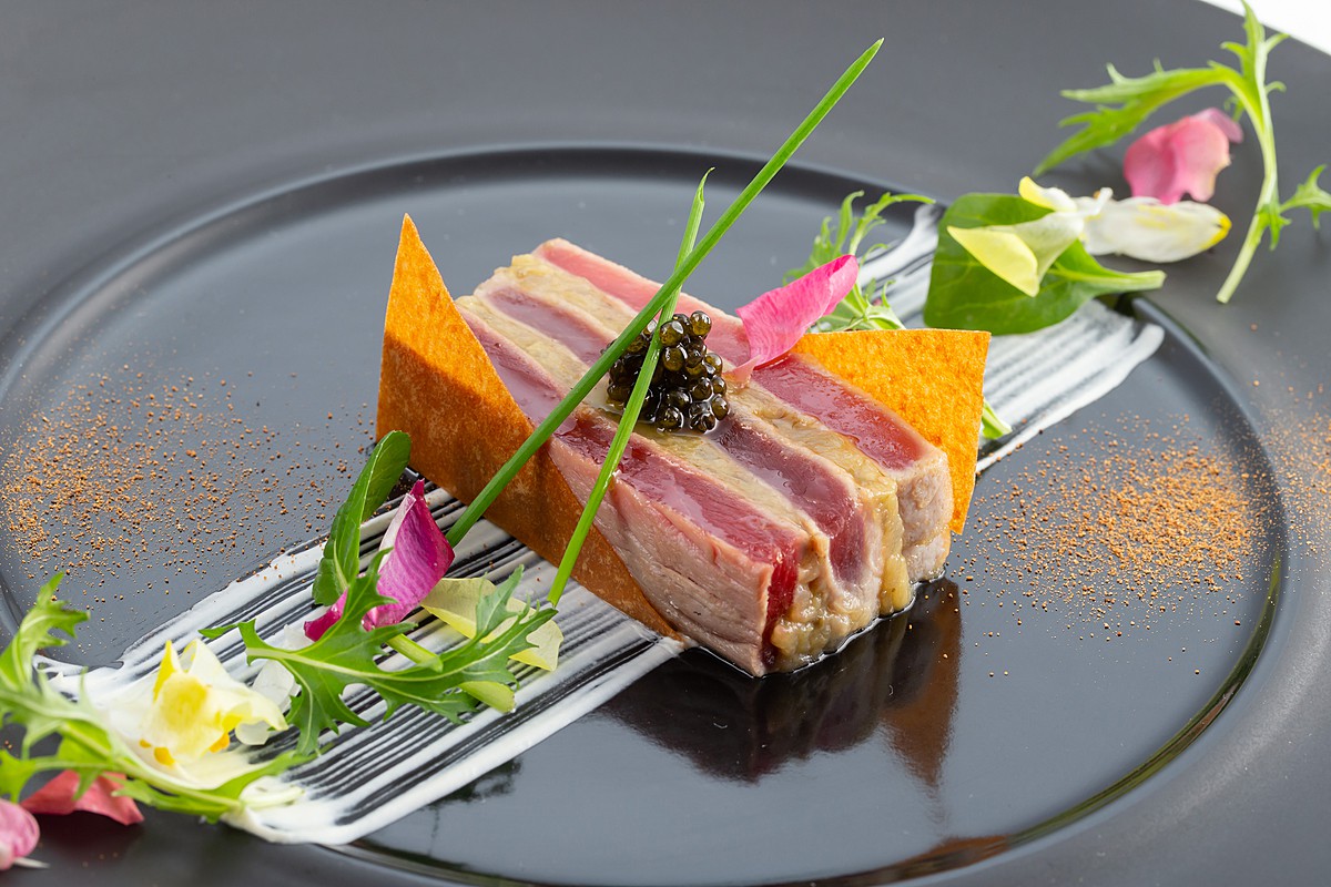 ①フルーツトマトとつぶ貝のクープ ②鮪のミキュイ燻製風と茄子のミルフィーユ仕立て ③雲丹のフランと人参のポタージュ ④金目鯛のコンフィと北海道産帆立のかぼす香るナージュ風 ⑤仙台黒毛和牛の低温ロティーと黒豆味噌でマリネしたフォアグラのソテー ⑥ゆりの香りのコンソメと南高梅のスープリゾット ⑦京抹茶と黒糖ジュレのコンポジション