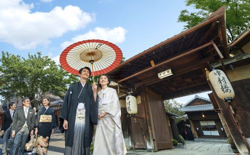 祇園・八坂神社の鳥居内に佇む老舗料亭を、1日1組限定で完全貸切に。480年の歴史が息づく空間で、本物の和婚を叶えられます。