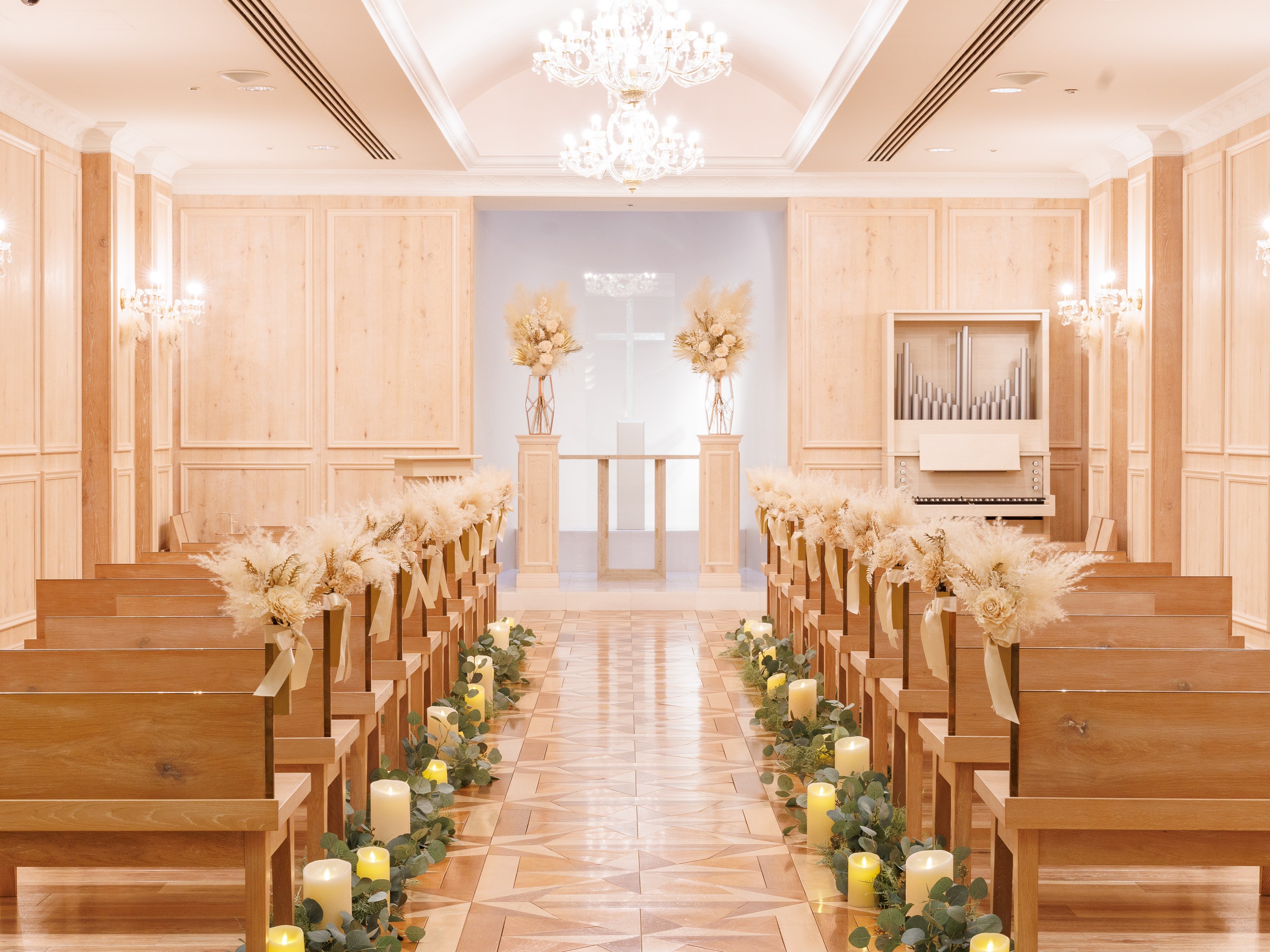 オリジナルロビー挙式、木の温もり溢れるチャペル、館内神殿を用意。もっともふたりらしい姿で、大切なゲストに感謝の気持ちを伝える最良の一日を演出します。