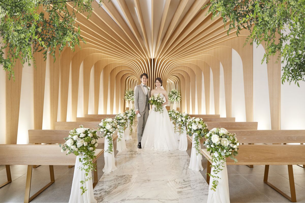 木の温もりと柔らかい光がおふたりの誓いの場を優しく包み込む、心地よい空間が広がる広島チャペルです。都会の洗練された空気とナチュラルなあたたかさが程よく調和した雰囲気はこだわりのアットホームウエディングをお考えのおふたりにぴったりです。