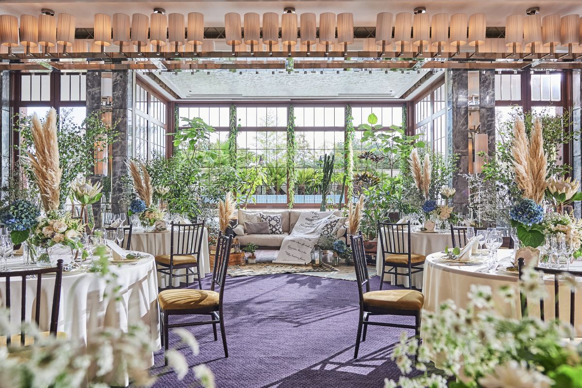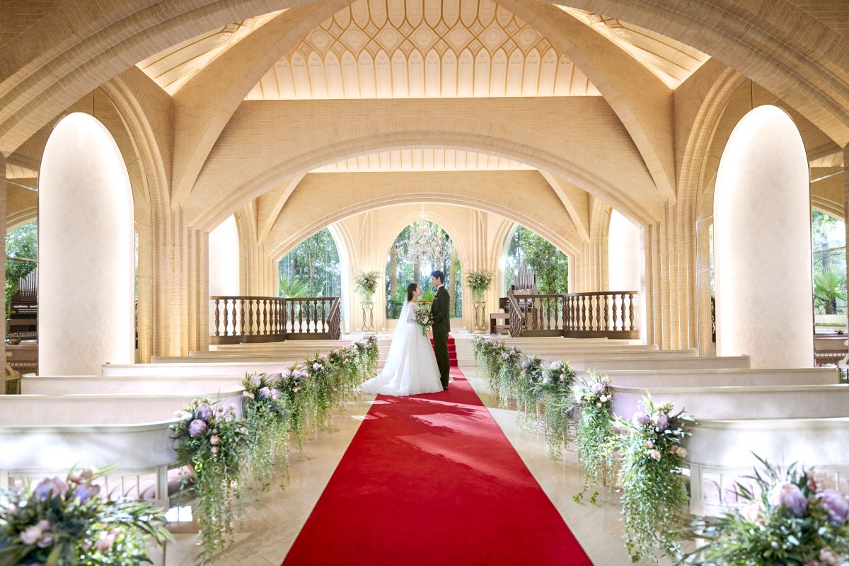 大きな窓から自然光が降り注ぎ、緑溢れる開放感のある挙式会場。入場口一面に設えたステンドグラスが、入場シーンをより印象的に。さらに感動の映像演出で親御様やご親族様と意味のあるお式になります。