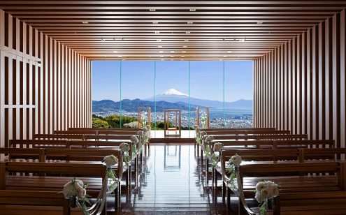 静岡らしい風景の中、温かな自然光がおふたりを優しく包みこむ挙式場です。富士山に見守られながら特別なお時間をお過ごしいただきます。