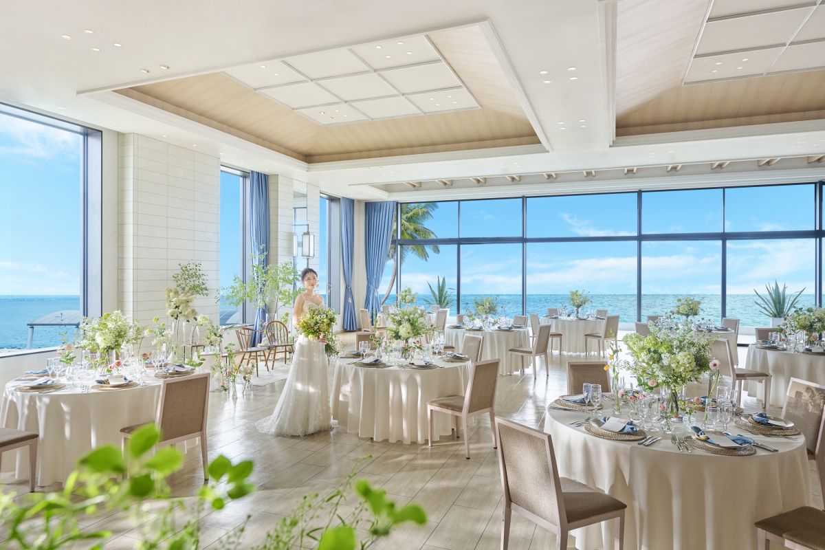 ザ・サーフ オーシャンテラスでは、広大な海と空を目の前に愛を誓う、贅沢なセレモニーが叶います。美しい光景をそのまま映し出すスタイリッシュな空間は、式のテーマに合わせて自由な装飾や演出ができるのも魅力。すべての方の心に刻まれる、おふたりらしい誓いの時をお過ごしいただけます。