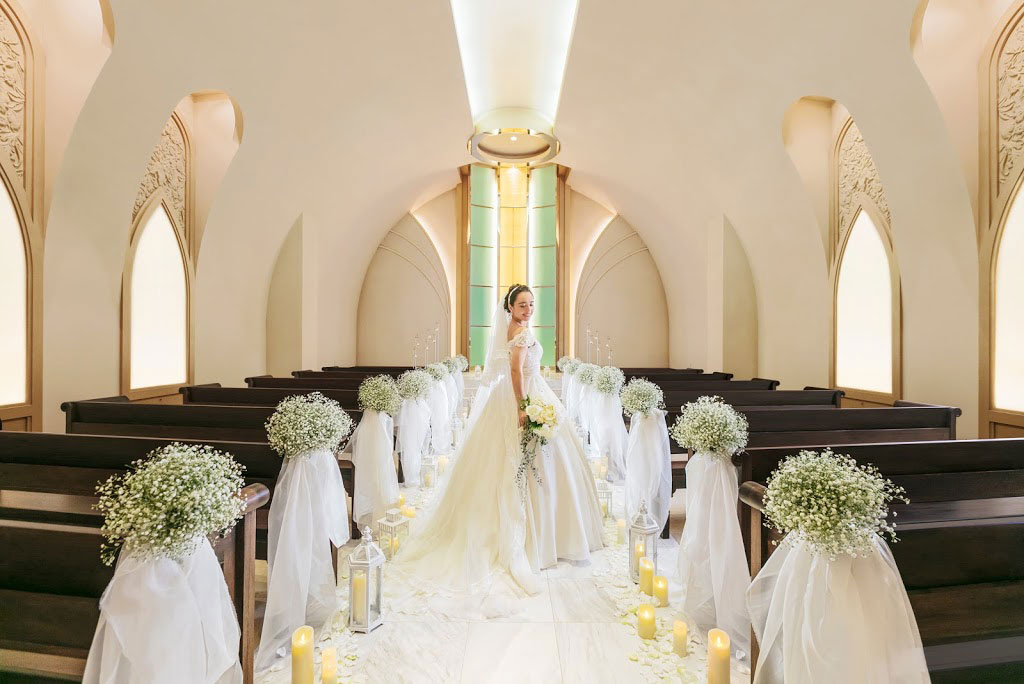 永遠の愛を誓う場所は、神聖で厳かな空間。白い大理石で作られたバージンロードに、天まで伸びゆく高い天井。沢山の参列者に祝福される喜びは忘れがたいものに。お二人が巡り会い共に歩む決意も新たになるはず。