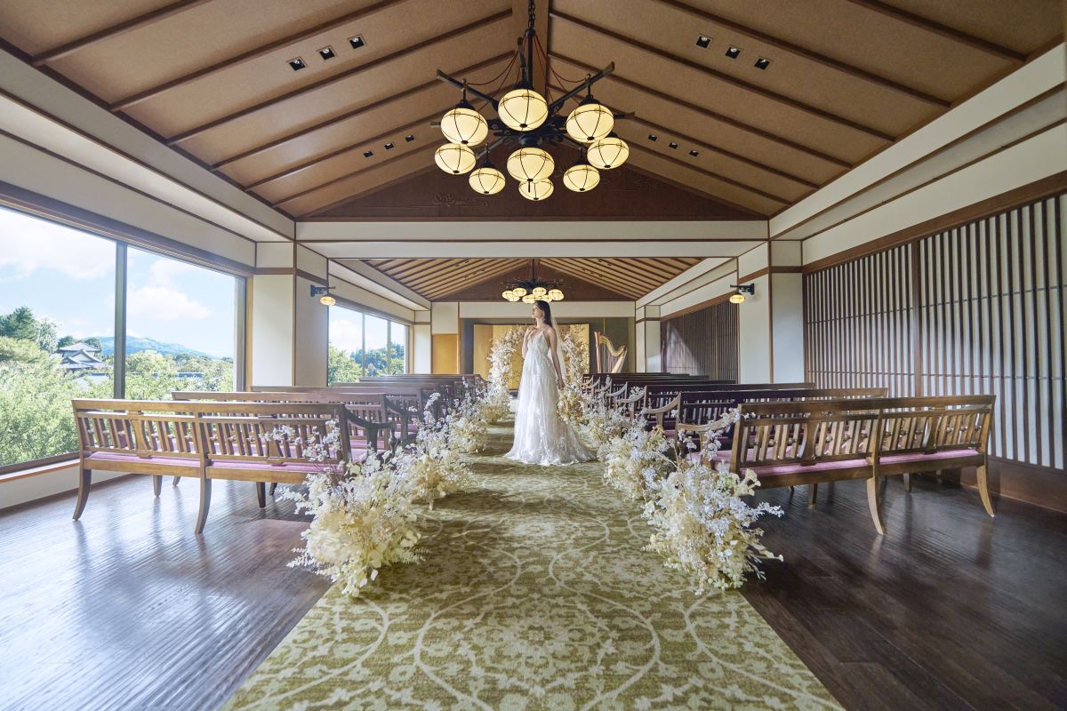 奈良の雄大な自然と、木のぬくもりを感じる和・洋どちらも映える挙式会場。シンプルに整えられた空間で感動的なセレモニーが実現できます。