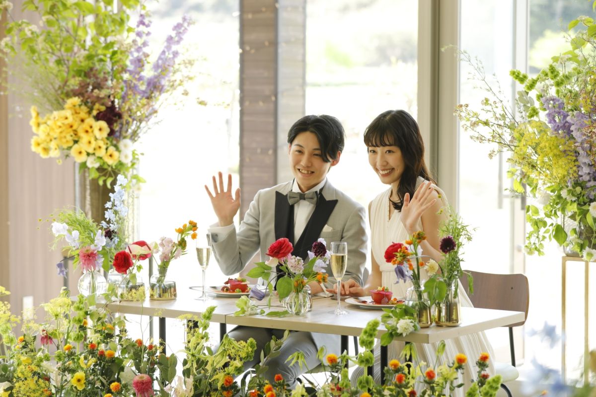 会場使用料(プロデュース込)/料理・ドリンク(プリフィックスコース)/乾杯ドリンク人数分プレゼント/新郎新婦衣装(持込可)/装花・装飾(持込可)/カメラマン(持込可)/司会(持込可)/ケーキ(持込可)/音響照明(プロジェクター)