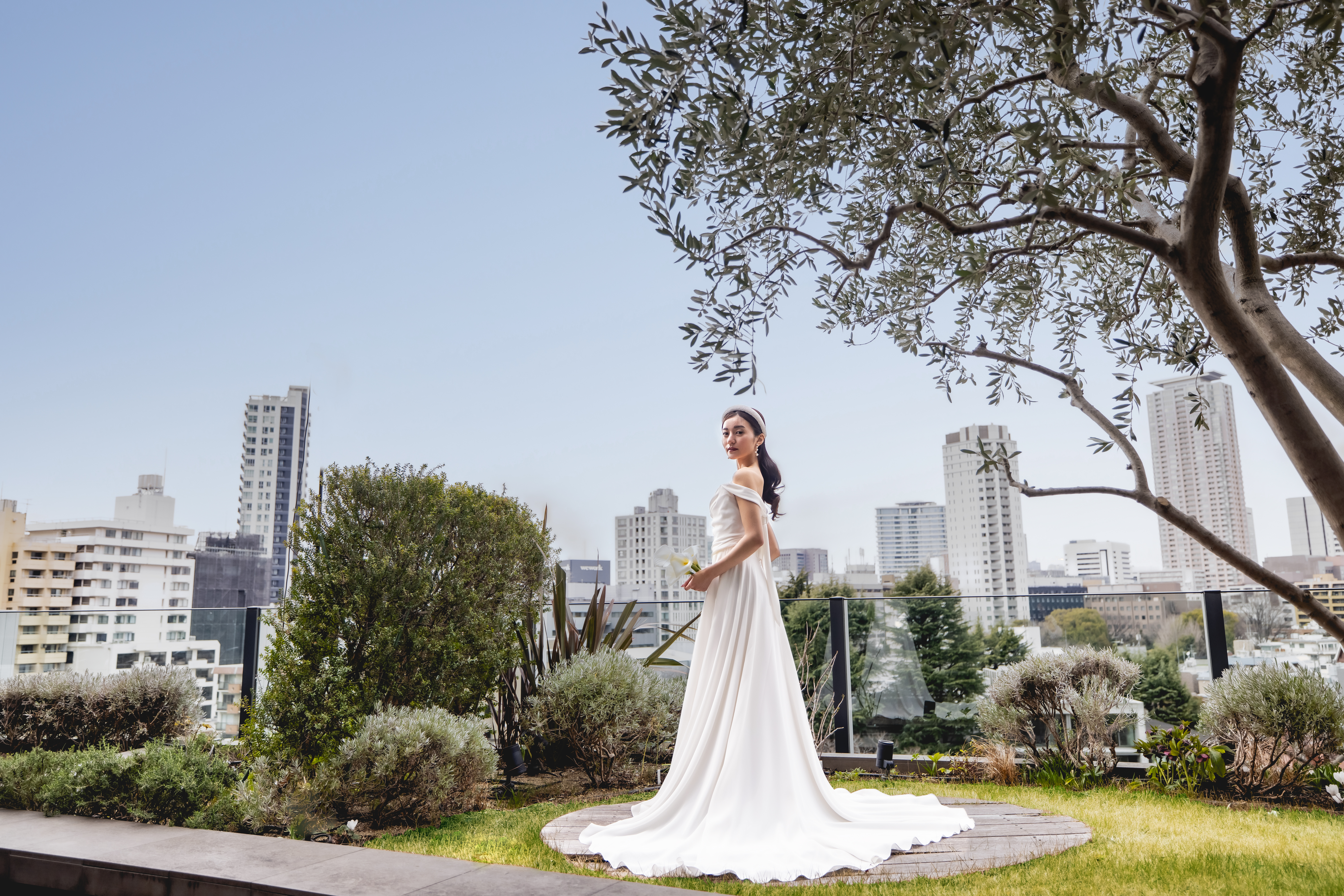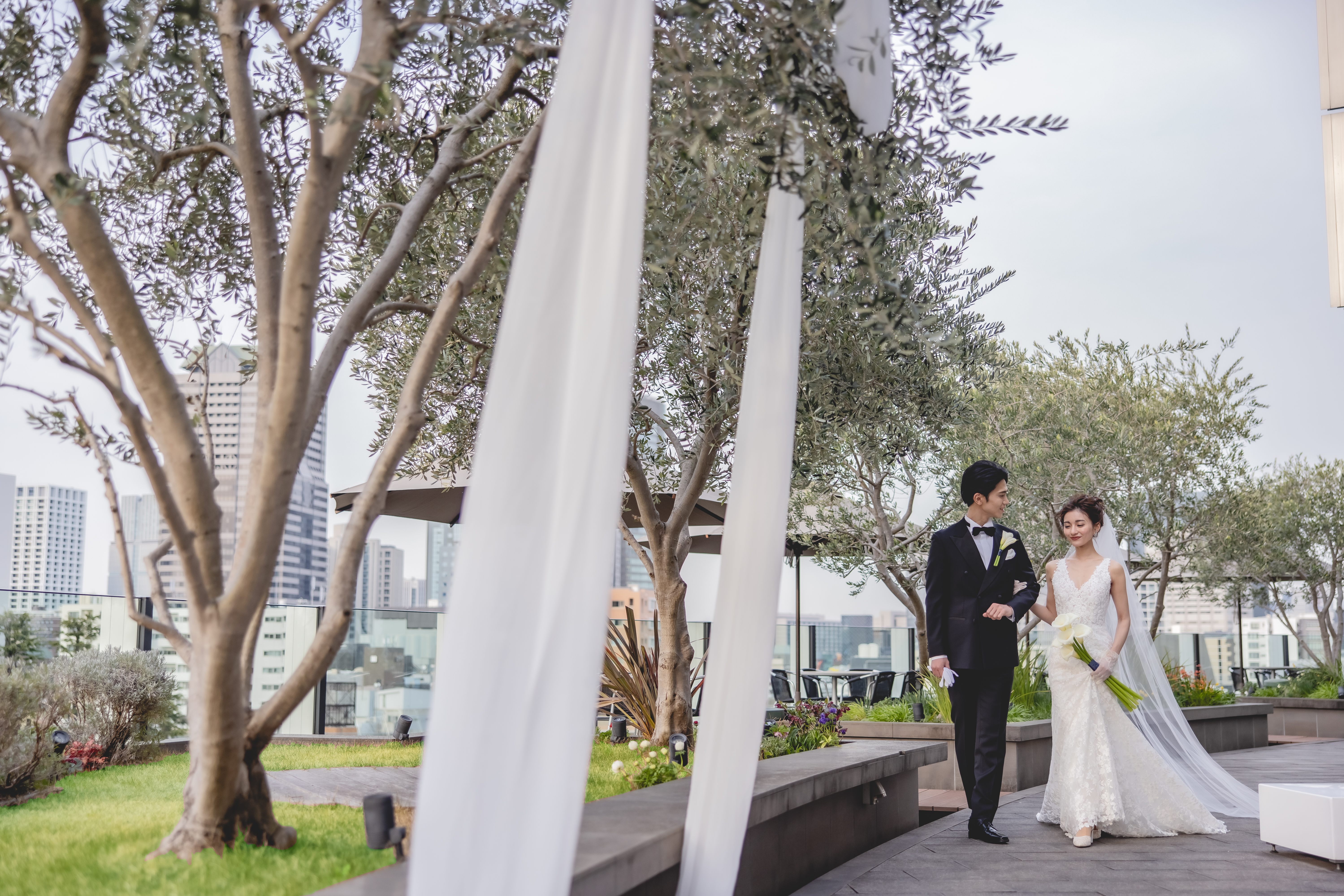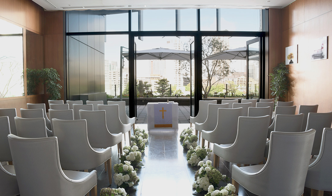 都心を見渡す眺望と、緑溢れる自然を感じる広々としたガーデンテラス。テラスでアペリティフを楽しんだら、グラスに揺らぐシャンパーニュの優美な動きを艶やかに表現したメタルワークが特徴的な店内で披露宴を。