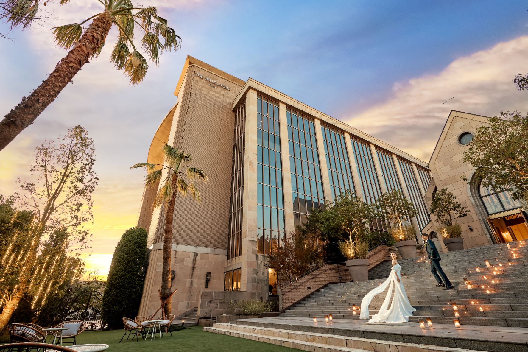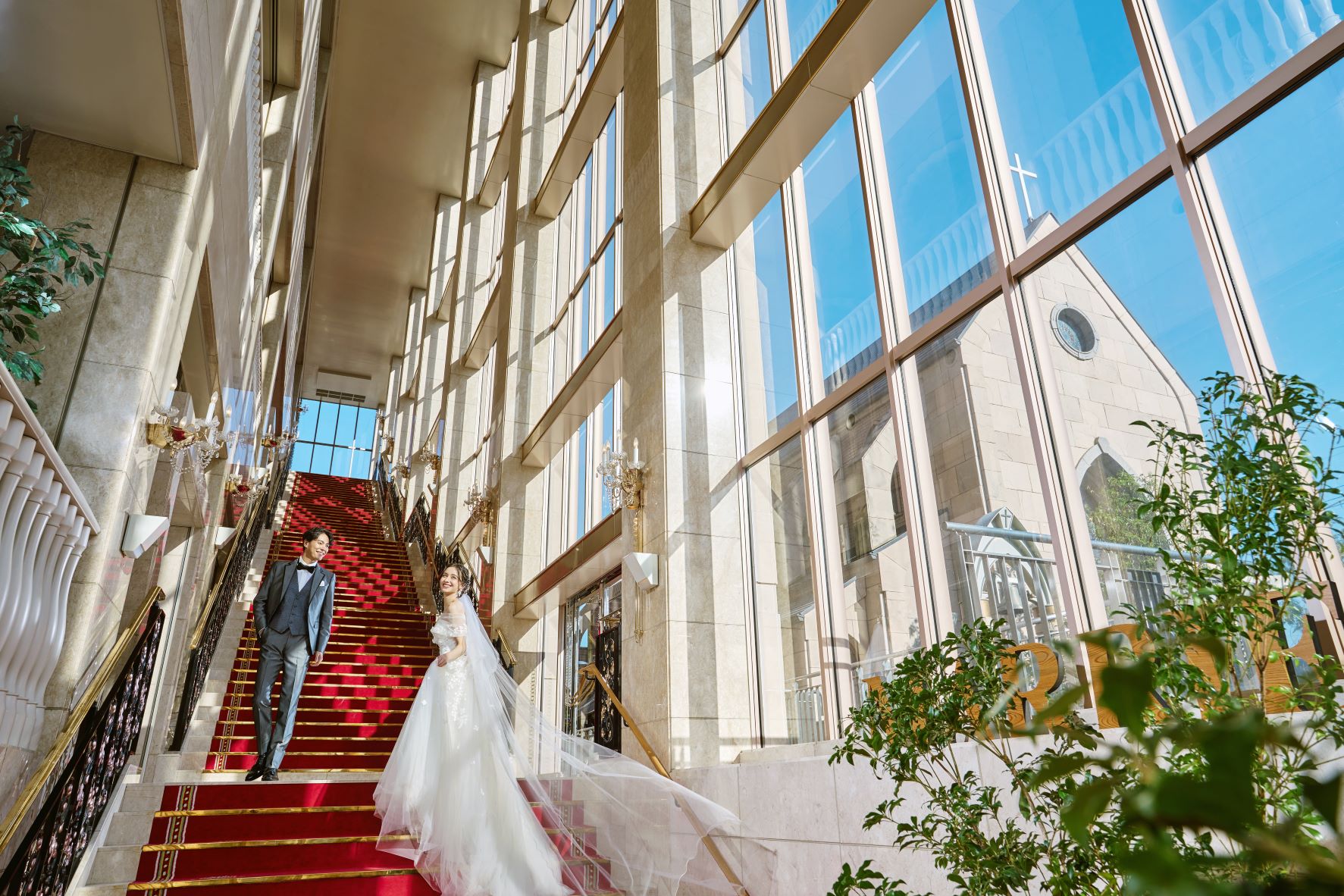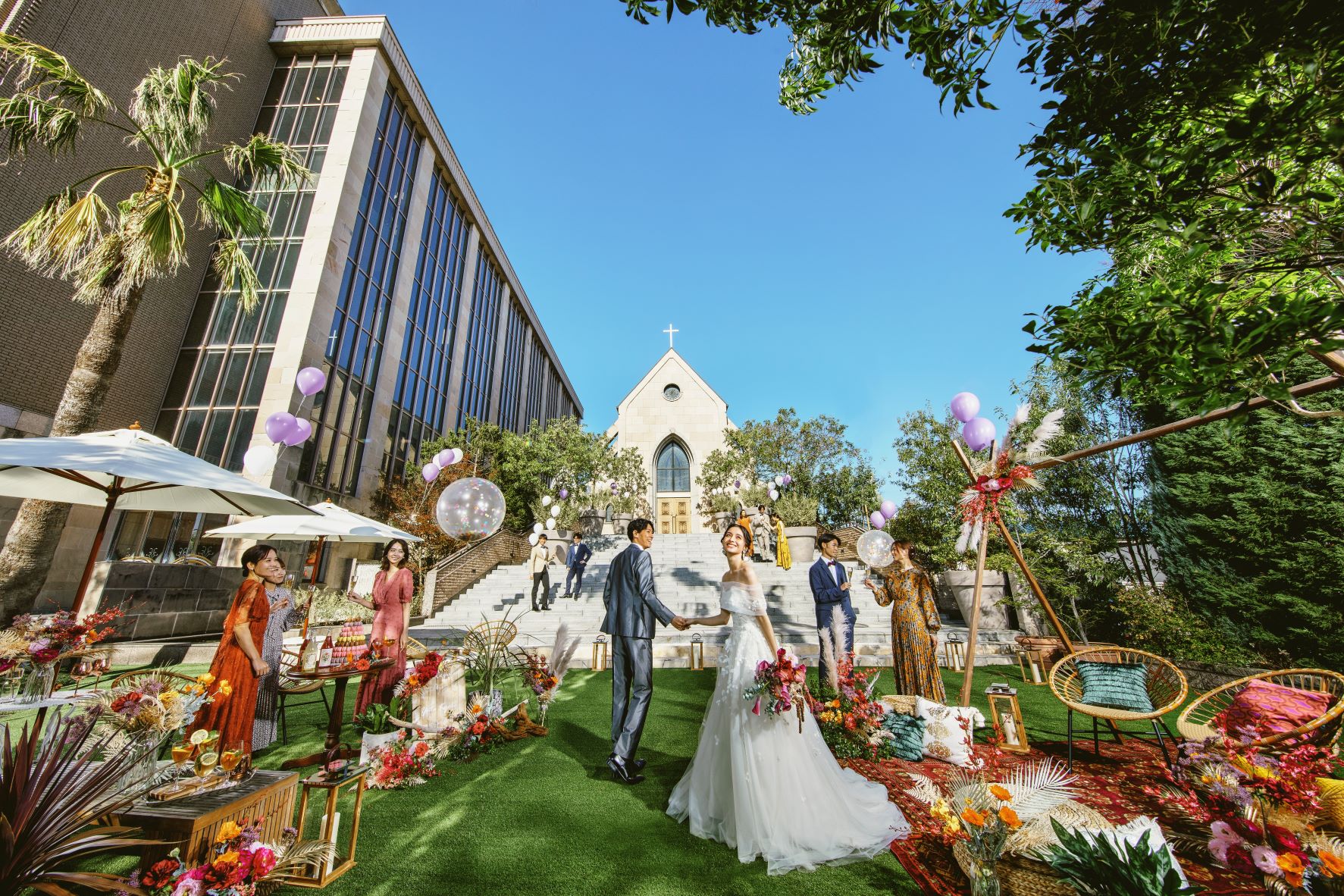 中世ヨーロッパの雰囲気漂う大聖堂での挙式が叶う、壮麗な空間。ワンフロア貸切の披露宴会場では、プロジェクションマッピングなど多彩な演出が可能。緑豊かなガーデンではデザートビュッフェも楽しめ、ゲストとの特別な時間を演出します。