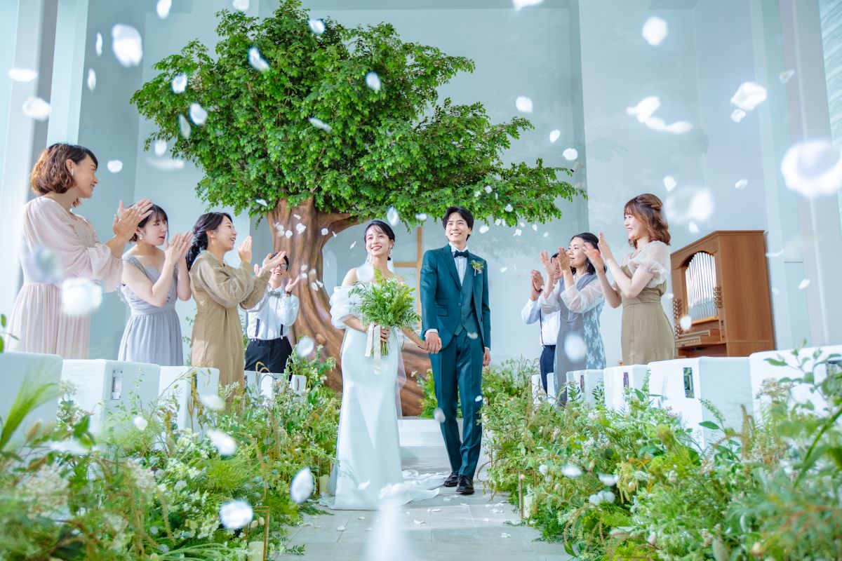 天井高7mの独立型チャペルは壁三面がガラス張りとなりあたたなか陽光が差し込む中で永遠の愛を誓えます。