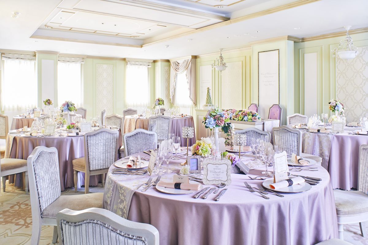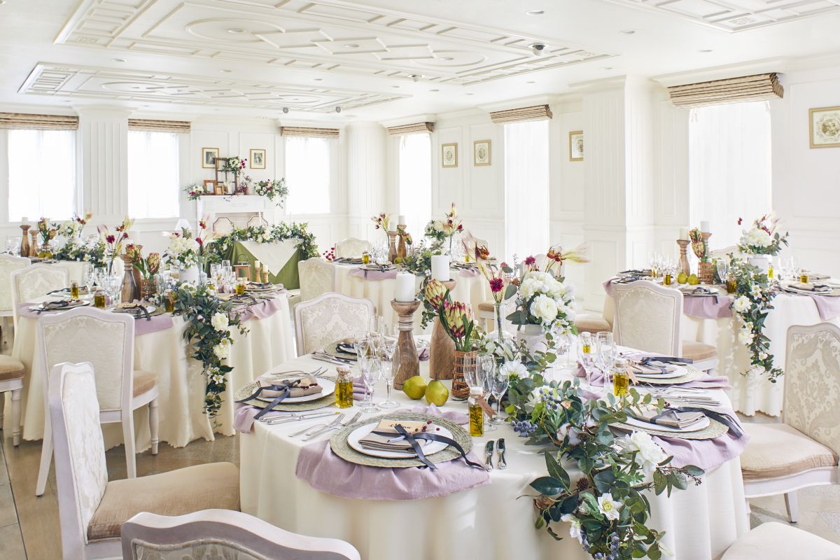 白いキャンバスに彩りを添えるように多彩なテーブルレイアウトから創り上げるおふたりらしいパーティ