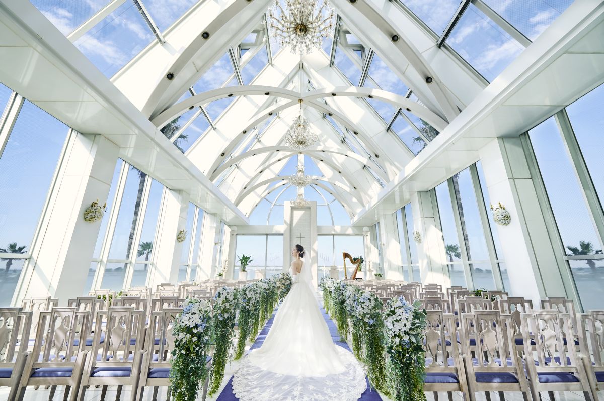 空と海を望むガラス張りのチャペルと、「航海」をテーマにデザインされた2つの披露宴会場はいずれもオーシャンビュー。たくさんのゲストと心から楽しみたいふたりにピッタリのゲストハウスです。