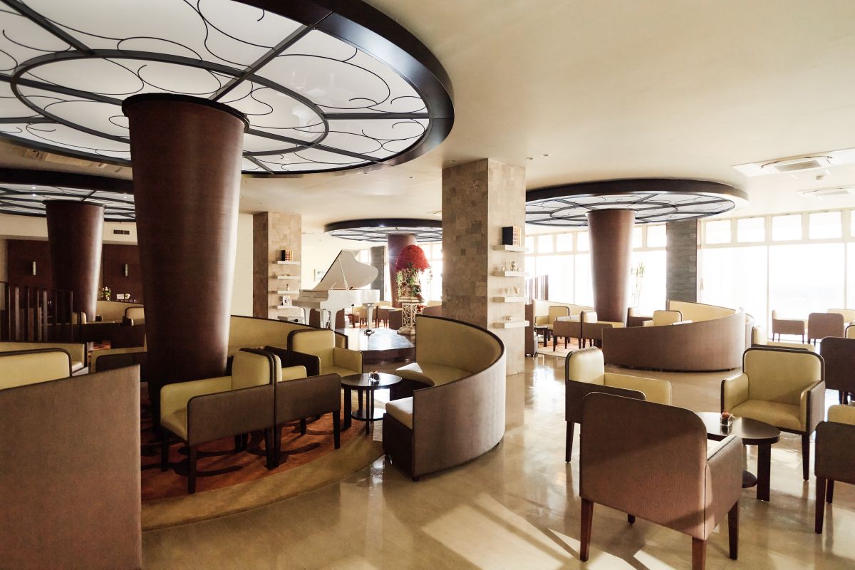 爽やかなシャンデリアと海と空の青がしなやかに繋がりを見せる、幻想的な空間