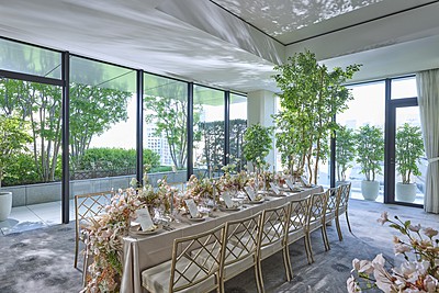 緑と空につながっているような開放的な会場から少人数専用のパーティルームまで多彩にご用意。いずれもゲストとの距離感を大切に、一体感をお楽しみいただけるレイアウト・演出にこだわっています。